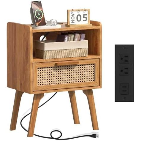 实木腿藤编带抽屉充电床头柜 50%OFF