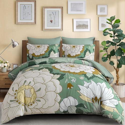 DJY 7 件雅丝绿花卉图案女王款舒适床品套装,植物图案收纳袋式床品 50%OFF